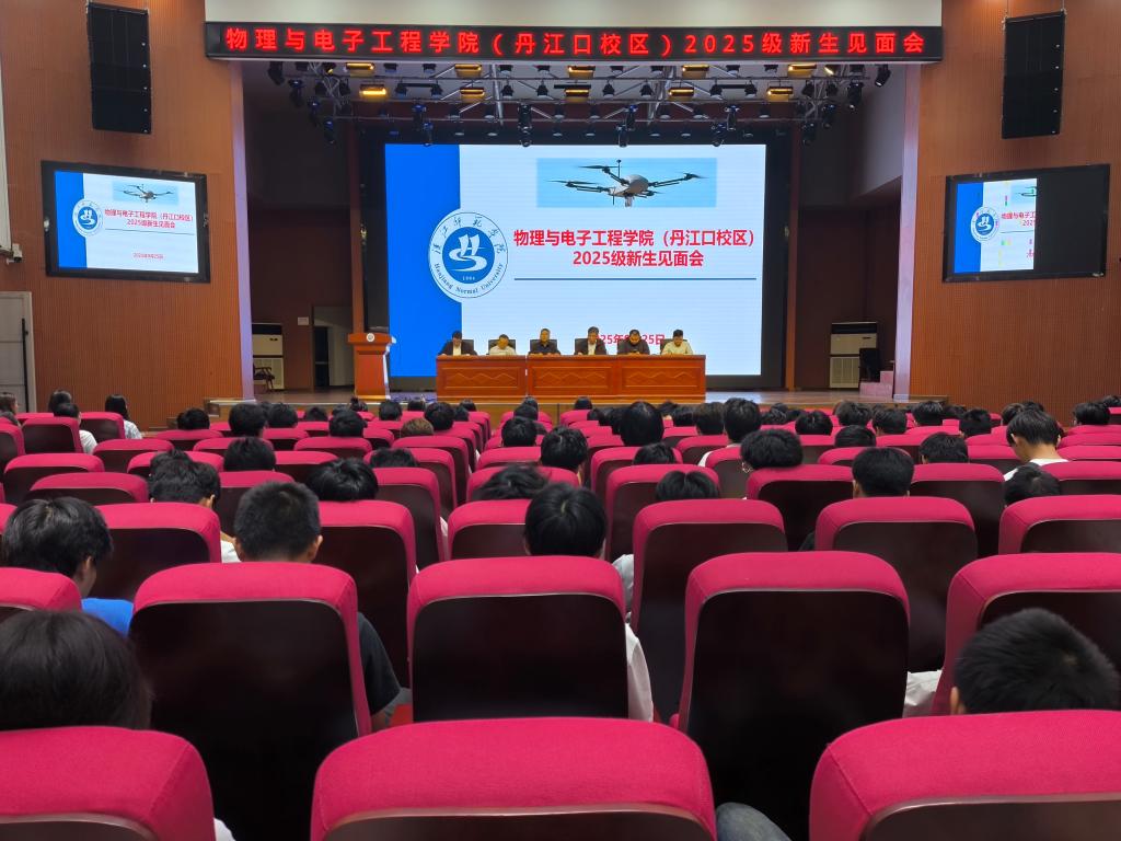 9月25日晚,物电学院(丹江校区)2025级无人机应用技术专业新生入新生见面会在沧浪剧场隆重举行。院分党委书记唐传球、丹江校区分党委副书记彭涛、副院长刘锋、院长助理史长城、专业负责人张磊、全体辅导员以及2025级无人机应用技术专业新生参会。大会由院分党委副书记戴俊主持。