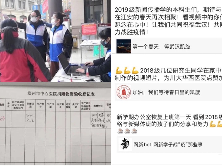 疫情爆发以来,万博官网不少同学通过多种方式,志愿参与抗疫服务,传递温暖。2019级100余名硕士研究生自发筹款,为前线医务工作者募集133副护目镜,由张宇轩为前线医务工作者送去护目镜。2017级新闻学专业本科生张恩铭同学主动报名家乡发起的“关爱抗疫医护人员子女志愿辅导团”,为一位父亲正奋战在南充抗疫一线的高三男孩进行线上学习辅导,主动关心对方情况。2017级网络与新媒体专业本科生王小翠报名参与“雷火救援志愿者”,协助打通救援的信息通道。