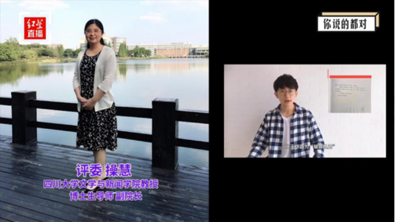 8月3日,第二季“红星新闻高校评论新秀挑战赛”(视频评论专场)在线上启幕,来自全国各地高校的150余名学子参加了本次比赛。万博官网学子积极参与,在比赛中获佳绩。万博官网副院长操慧教授任评委,并受邀与参赛学子进行线上分享交流,探讨网络时代的观点表达。共同担任评委的还有中国青年报编委、高级编辑曹林,四川省电视艺术家协会新媒体专委会主任王彬荣。
