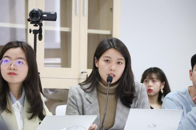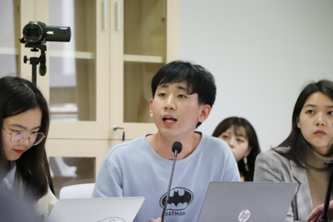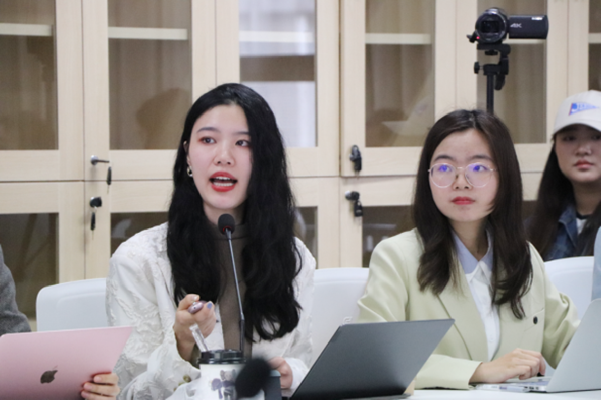 本科生陈宋釜在发言中谈到,当今一些报道中花里胡哨的新闻语言会导致新闻娱乐化与新闻伦理失范。他还结合《毛泽东选集》中的其他文章以及自己在新闻媒体的实习经验,谈了自己对新闻报道的社会责任的认识。