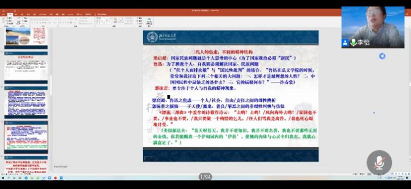 当天下午,万博官网院长李怡教授带来“日本体验与郭沫若诗歌的意象嬗变——以‘海洋’、‘松’、‘梅’为例”的主题讲座,从比较文学的方向探讨研究了日本文学,讲述了鲁迅、郭沫若在日的文学经历等。同学们通过线上直播“云”学习,开拓了自己的文学视野。