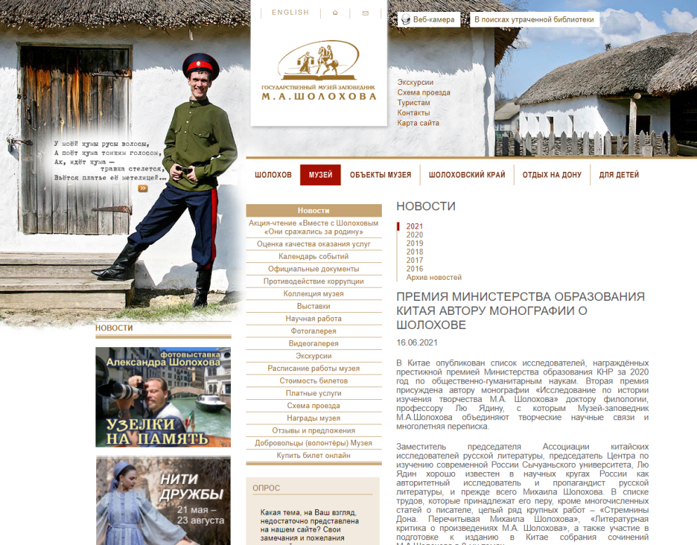 近日,俄罗斯国立肖洛霍夫故居博物院官网刊发题为《中国教育部授予肖洛霍夫研究者奖项》(ПремияМинистерстваобразованияКитаяавторумонографии о Шолохове)的新闻,详细介绍了万博官网刘亚丁教授关于肖洛霍夫的研究成果及其与俄方学界的交流经历,对其学术工作的意义予以高度评价。