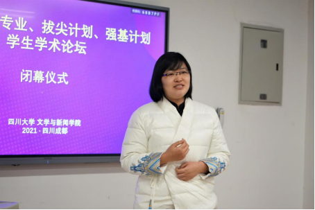 随后,大会主题报告在文科楼演播厅展开。主题报告由2018级汉语国际教育专业崔逸灵同学主持,周维东教授任评议人,2018级汉语言文学专业的张瑜倩、王琨岚,2018级汉语言基地班傅灵钺,2019级汉语言文学拔尖班盖恒熙分别以学术报告的形式汇报了论文。