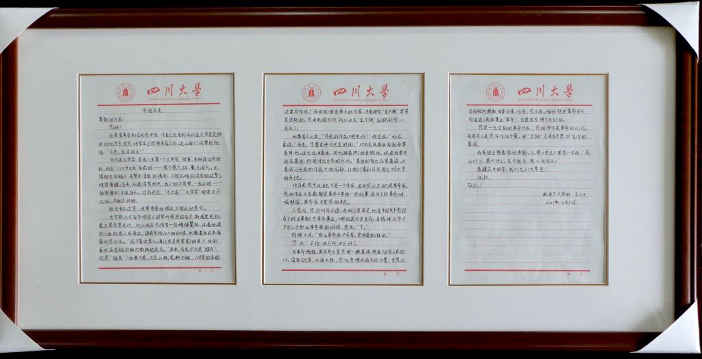 王沁是第七届“马识途文学奖”一等奖的获得者,本科阶段曾经攻读法学的他现在已经在万博max官网攻读硕士学位。王沁在信中写道:“对我而言,‘马识途’、‘文学奖’是无可比拟、不能忘怀的。”他在面对川大中文系时,曾经十分没有底气,但是“知道得奖那天,一夜未眠,被鼓舞到不能自已。”
