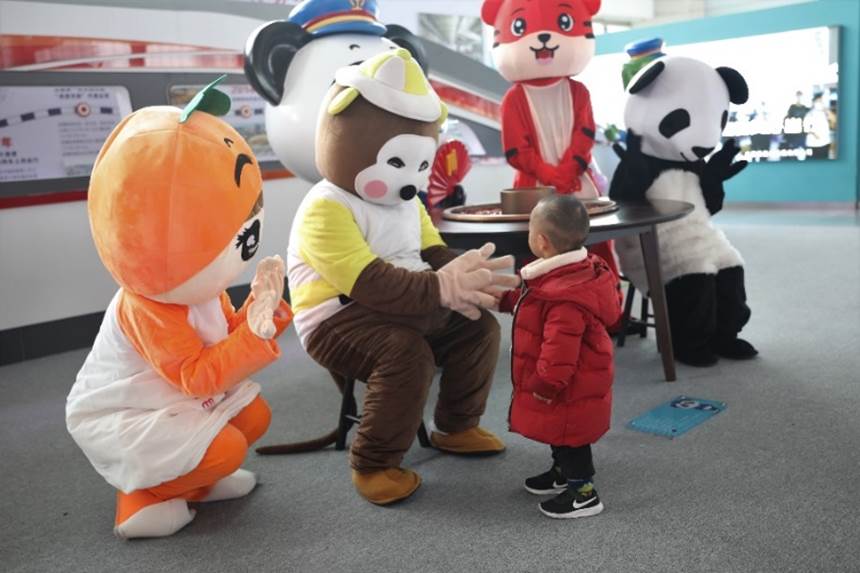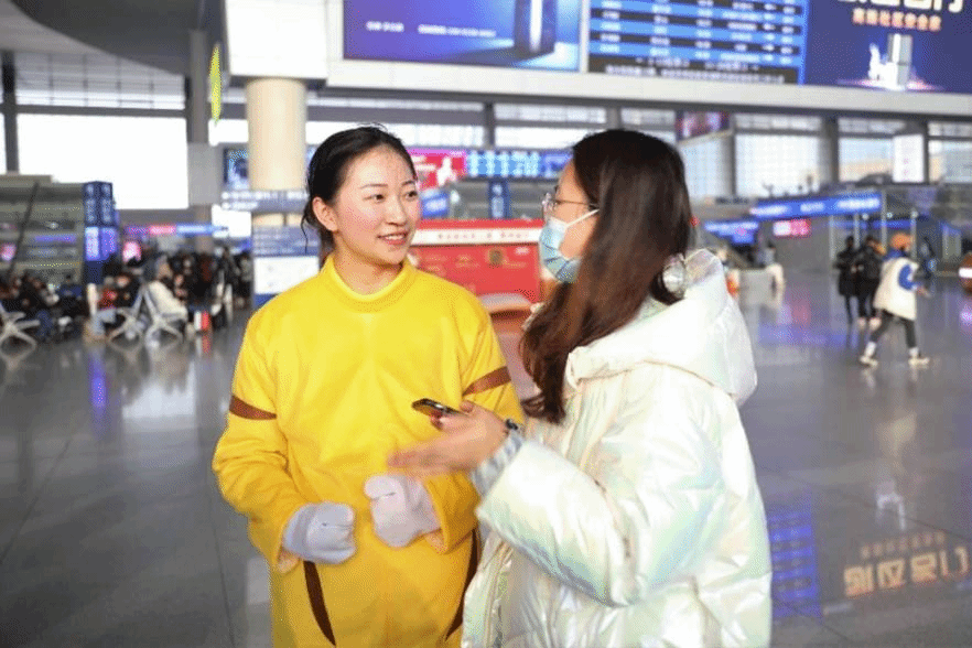 人群中,客运员龚怡穿起熊猫玩偶服,摇摇摆摆地朝着一脸好奇的孩子走去。自从春运启幕,她便和三十余位同事一起,在休班时段装扮成可爱的玩偶模样,或是向行人致以节日问候,或是蹦蹦跳跳地陪同幼儿旅客玩乐。期间,龚怡也会和同事们一起,解答出行问题,协助旅客们绑定取用车票。