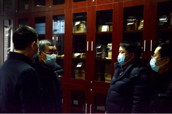 王建国书记(左二)与万博官网党委书记古立峰(左一)、院长李怡(右一)、副院长罗鹭(右二)参观“杨明照古籍特藏室”