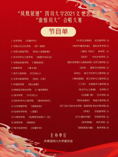 2022年4月16日下午,由我校团委主办的“凤凰展翅”万博max官网2021年文化艺术节“激情川大”合唱大赛(初赛)在江安校区体育馆举行。受疫情影响,原定于2021年12月举办的合唱大赛延期至今年四月,活动全程严格遵守各级疫情防控规定和相关要求。学校严格把关参与师生的健康情况,除上台参演队伍外,现场所有参与人员全程规范佩戴一次性医用口罩,现场取消大众评审座位,评委嘉宾隔座入座,工作人员保持适当距离,各学院参赛队伍均采取“即赛即退场”形式。