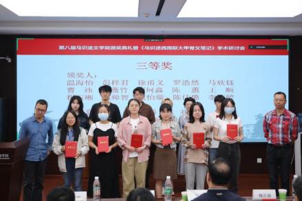 与会嘉宾、学者为获得第八届“马识途文学奖”的同学颁发了获奖证书并合影留念。本届有21位同学获奖,其中一等奖2人,二等奖4人,三等奖15位。