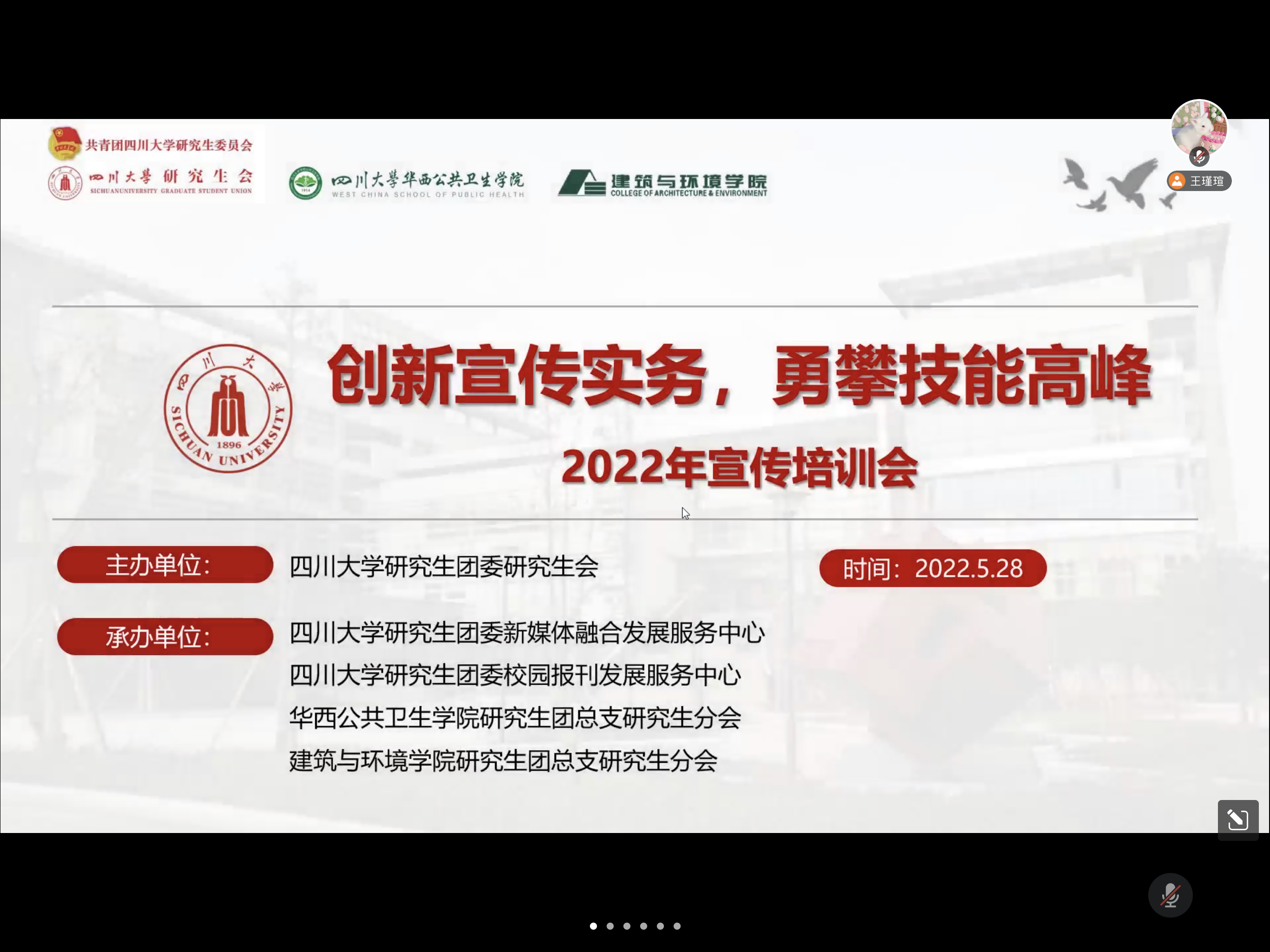 2022年5月28日下午,由万博max官网研究生团委研究生会主办,万博max官网研究生团委新媒体融合发展服务中心、万博max官网研究生团委校园报刊发展服务中心、华西公共卫生学院研究生团总支研究生分会、建筑与环境学院研究生团总支研究生会联合承办的“创新宣传实务,勇攀技能高峰——2022学年宣传培训会”召开,会议对万博max官网校园宣传工作进行了培训与总结。