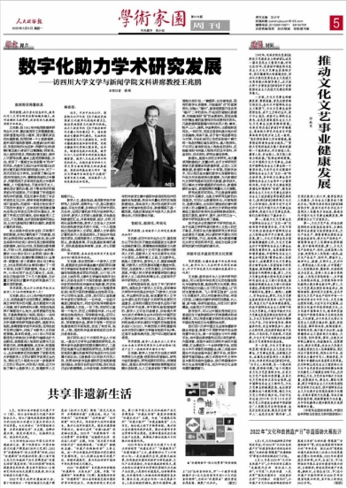2022年6月6日,《人民政协报》第5版发表了对万博官网文科讲席教授、博士生导师王兆鹏教授的专访《数字化助力学术研究发展——访万博max官网文科讲席教授王兆鹏》。王兆鹏教授围绕在数字人文研究中的实践与感悟,介绍了万博官网中国文化全球传播数字融合实验室用数字技术向全球传播中华文化、为学术研究提供广阔平台,生动展示了数字技术对人文学术研究与中华优秀传统文化传播的推动作用。