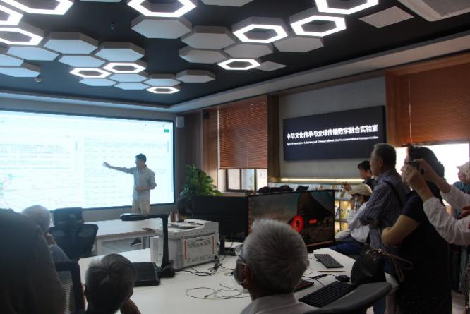 胡易容副院长带领老教师们参观文科楼一区大厅文化景观。大家又来到位于学院大楼负一楼的演播厅,胡易容副院长给大家介绍了学院大楼文化建设的一些情况,介绍了学院实验室的发展情况。随后,学院实验室主任邱树雄副教授通过PPT详细汇报了学院实验室近些年的建设情况,学院实验室现有1000多平米实验室房间,有包括新媒体创意、视觉传播、数字采编、脑电分析等10多个分实验室。现场还播放了学院宣传视频和学院中华文化传承与全球传播数字融合实验室宣传视频。介绍了演播厅的各类设备情况。退休教师肖键副教授表示:“进去之后第一个感觉是震撼,无论是屏幕、灯光或是印象都很专业、高端,演播室里观众席是阶梯状的、座椅很舒适、视觉感受很棒,深刻感受到传媒新技术正在为学院的发展提速。”