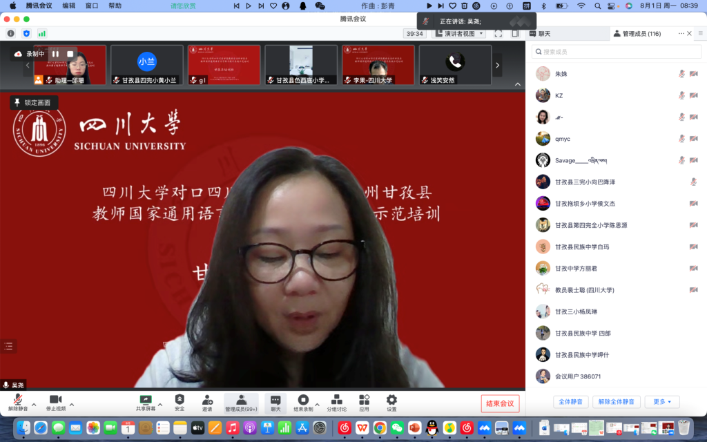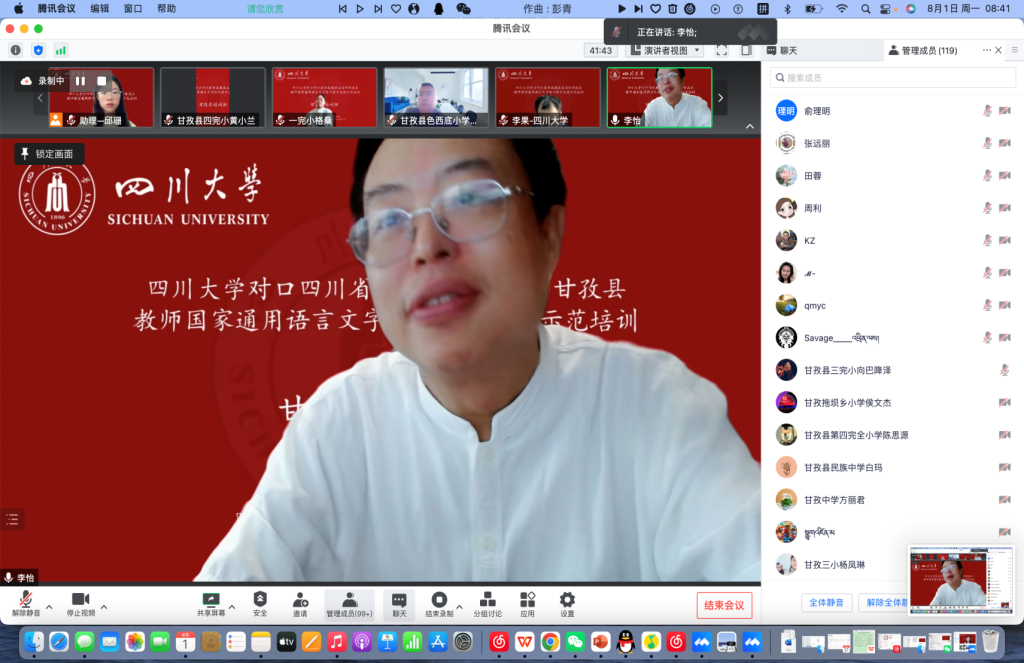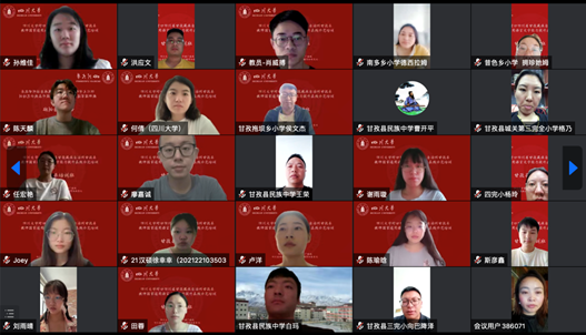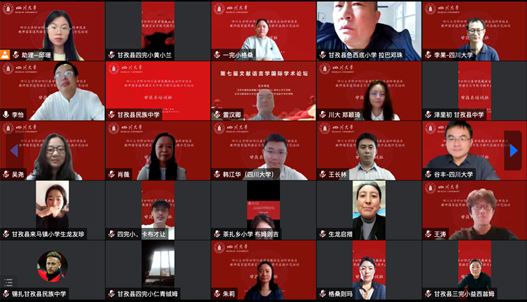 为深入贯彻党的十九大和十九届历次全会精神,落实全国语言文字会议和教育部党组关于教育脱贫攻坚成果同乡村振兴有效衔接的工作部署,2022年8月1日上午8点30分,万博max官网国家语言文字推广基地对口四川省甘孜藏族自治州甘孜县教师国家通用语言文字能力提升在线示范培训举行了线上开班典礼。出席此次典礼的嘉宾有我校人事处处长、国家语言文字推广基地常务副主任、语言文字工作委员会办公室主任吴尧教授,语言文字工作委员会办公室副主任朱莉老师,万博官网院长李怡教授,我校国家语言文字推广基地执行主任雷汉卿教授,甘孜县教育和体育局股长孙冬梅,我校人事处副处长王彤伟教授等14位专家教师、20位学生教员及全体参训学员。开班典礼由万博官网院长李怡教授主持。