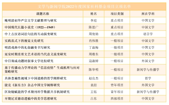 万博官网12项立项数的分布为:国家社科基金重点项目3项,一般项目6项,青年项目2项,西部项目1项。从国家社科基金学科分类来看,涉及中国文学、语言学、外国文学、新闻学与传播学、哲学5个学科。其中,中国文学共获6项立项,在全国设有中文系的学院中位居第一。