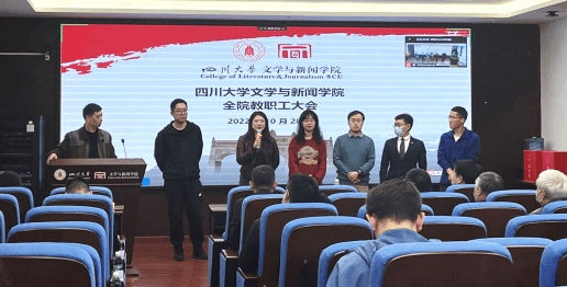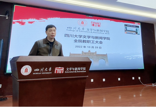 万博官网党委书记古立峰教授通报了学院近期重点工作。古立峰书记首先介绍了本学期新进的六位老师,分别是专职博士后郭旭东老师、侯建科老师、车祎老师、兰兴老师,辅导员郑格老师和党政办高小珺老师。接着传达了万博max官网第九次党代会召开和会议精神。随后,他通报了学院近期获得的一些成绩和表彰,如学院入选全国五所出版共建单位,目前正着力建设出版学院;设立在学院的语委基地积极开展普通话推广及调研活动,参与乡村文化振兴相关工作;万博max官网杰出教授、万博官网学术院长曹顺庆教授荣获四川省“四有”好老师称号;万博官网院长李怡教授荣获霍英东教育基金会高等院校教育教学奖二等奖;王炎龙教授荣获万博max官网第八届“姜维平优秀教学奖”二等奖;卢迎伏副教授荣获万博max官网2022年度“好未来教学名师奖”;万博官网副院长胡易容教授、饶广祥副教授、王长林副研究员荣获万博max官网2022年先进个人;戴路副研究员荣获万博max官网2022年优秀共产党员;万博官网党委荣获万博max官网2022年先进基层党组织称号等。对于取得的这些成绩,古立峰书记向全体教职工的辛勤付出和奋发努力表达了感谢与祝贺,同时他代表学院党委鼓励大家须更加团结奋进,上下同心,争取更好的成绩。会议最后,古立峰书记部署了本学期工作重点:认真学习贯彻落实党的二十大精神,学院全体上下要按照党中央和学校党委的安排部署,将党的二十大精神的学习宣传贯彻作为当前和今后一段时间最重要的政治任务来抓,将党的二十大精神的学习与学科专业、人才建设有机结合,为学院的发展做出新贡献。