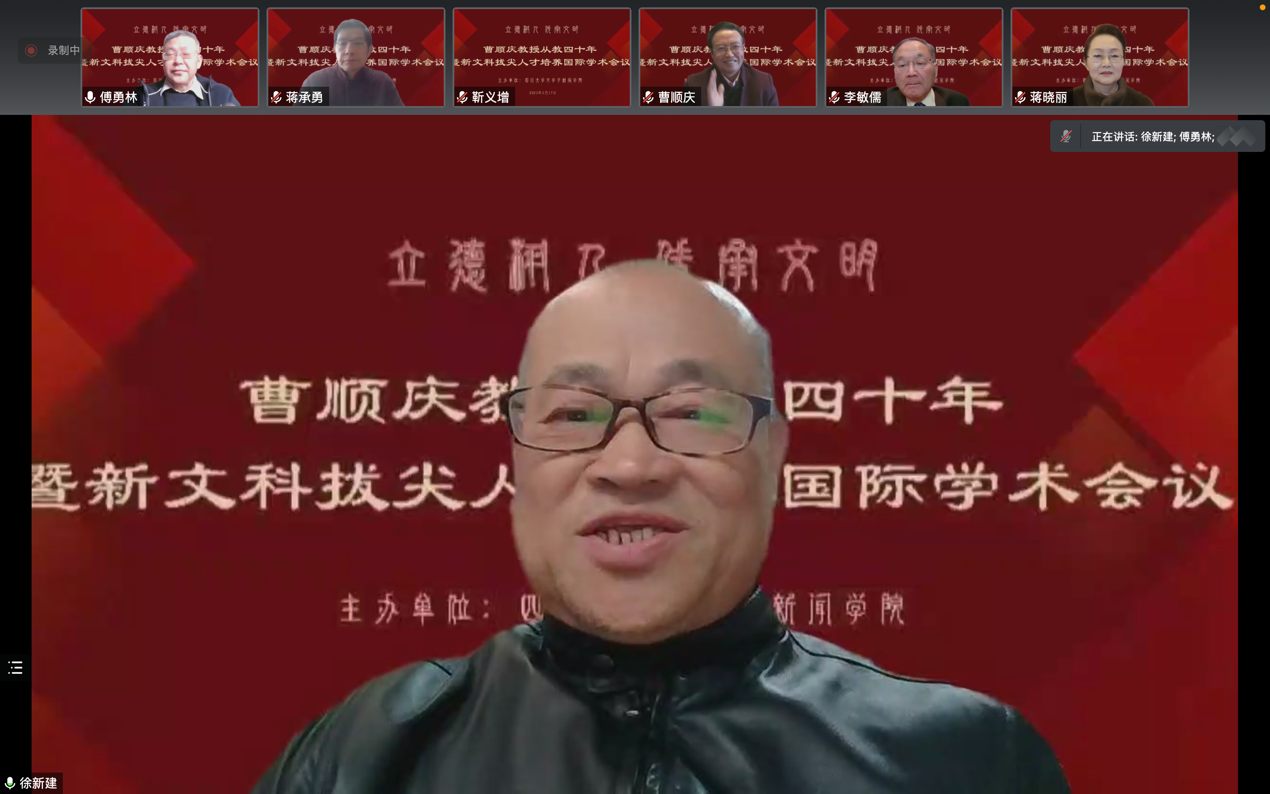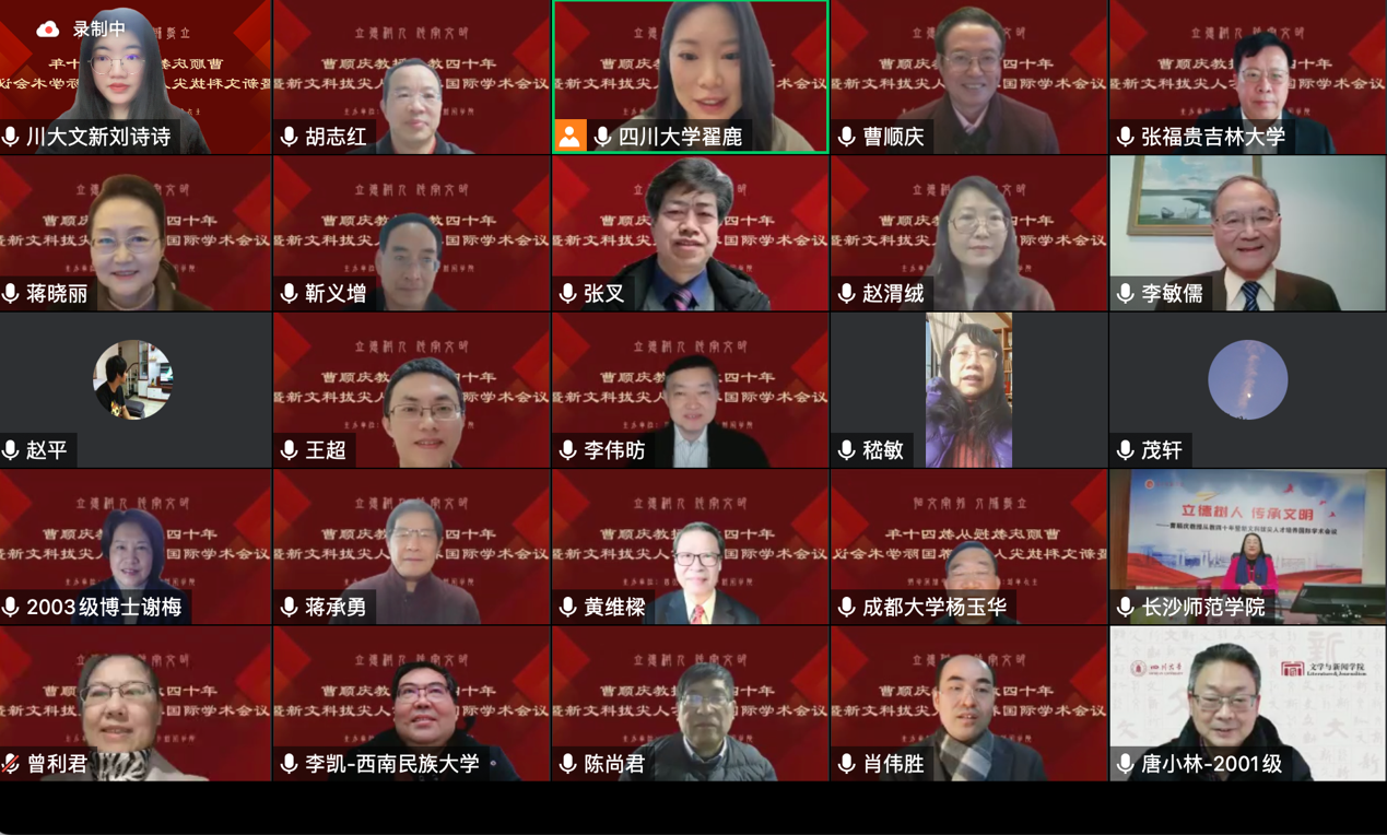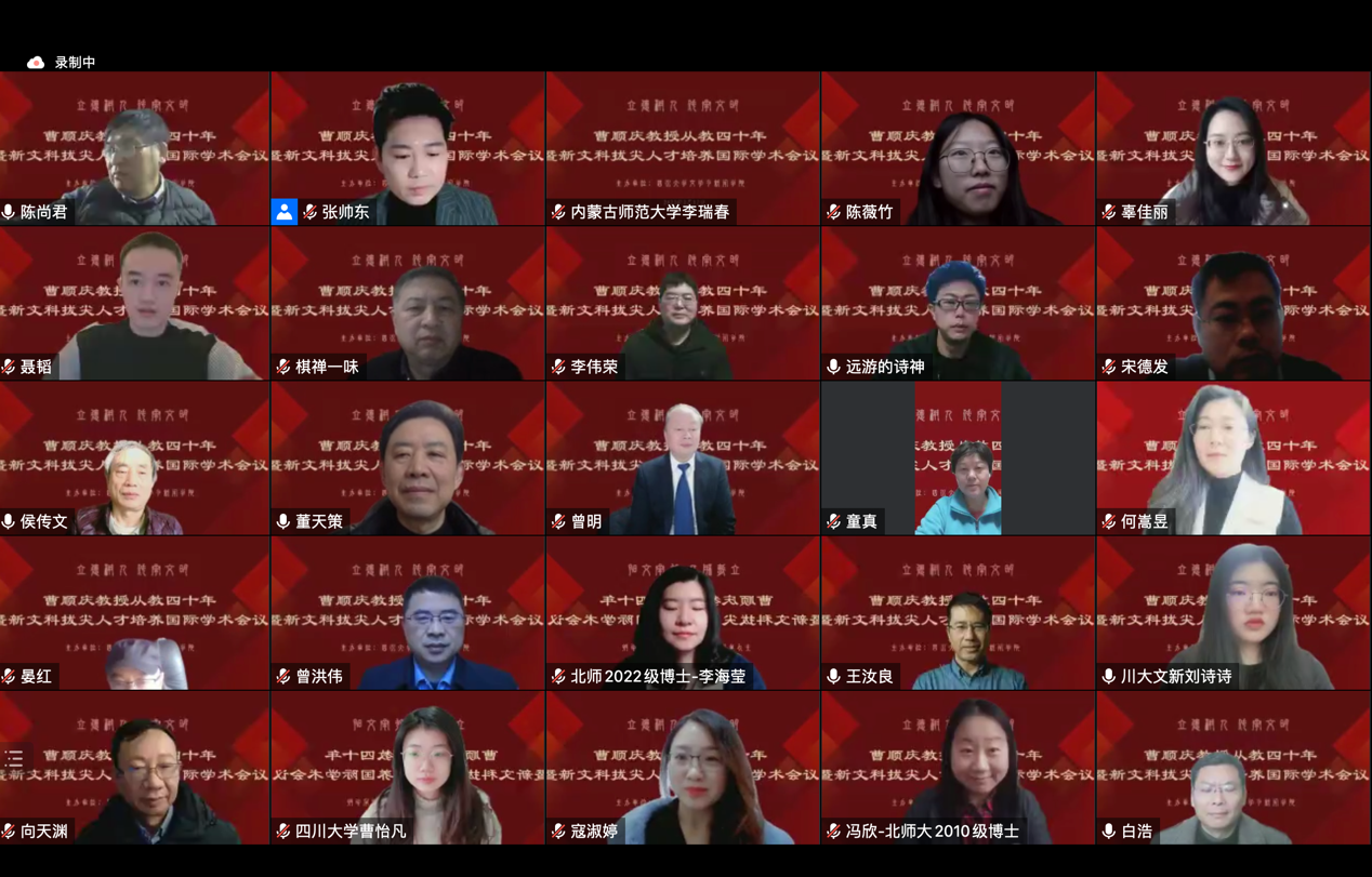 2023年2月17日,由万博官网主办的“立德树人 传承文明——曹顺庆教授从教四十年暨新文科拔尖人才培养”国际学术会议在云端顺利举行,来自法国索邦大学、美国俄亥俄州立大学、越南胡志明市国家大学、香港中文大学、中国社会科学院、北京师范大学、北京外国语大学、中央民族大学、首都师范大学、吉林大学、复旦大学、上海交通大学、浙江大学、浙江师范大学、浙江工商大学、河南大学、湖南大学、湘潭大学、长沙师范学院、华中科技大学、广西大学、暨南大学、电子科技大学、成都大学、四川外国语大学、四川师范大学、西南大学、西南交通大学、西南民族大学、重庆师范大学、重庆大学、贵州师范大学、西北民族大学、万博max官网等海内外近四十所高校的300余位学者参与会议。