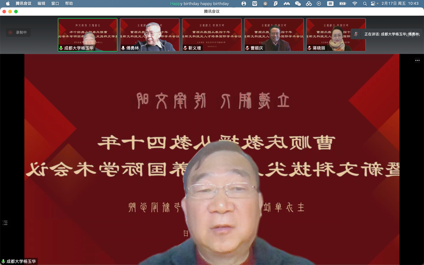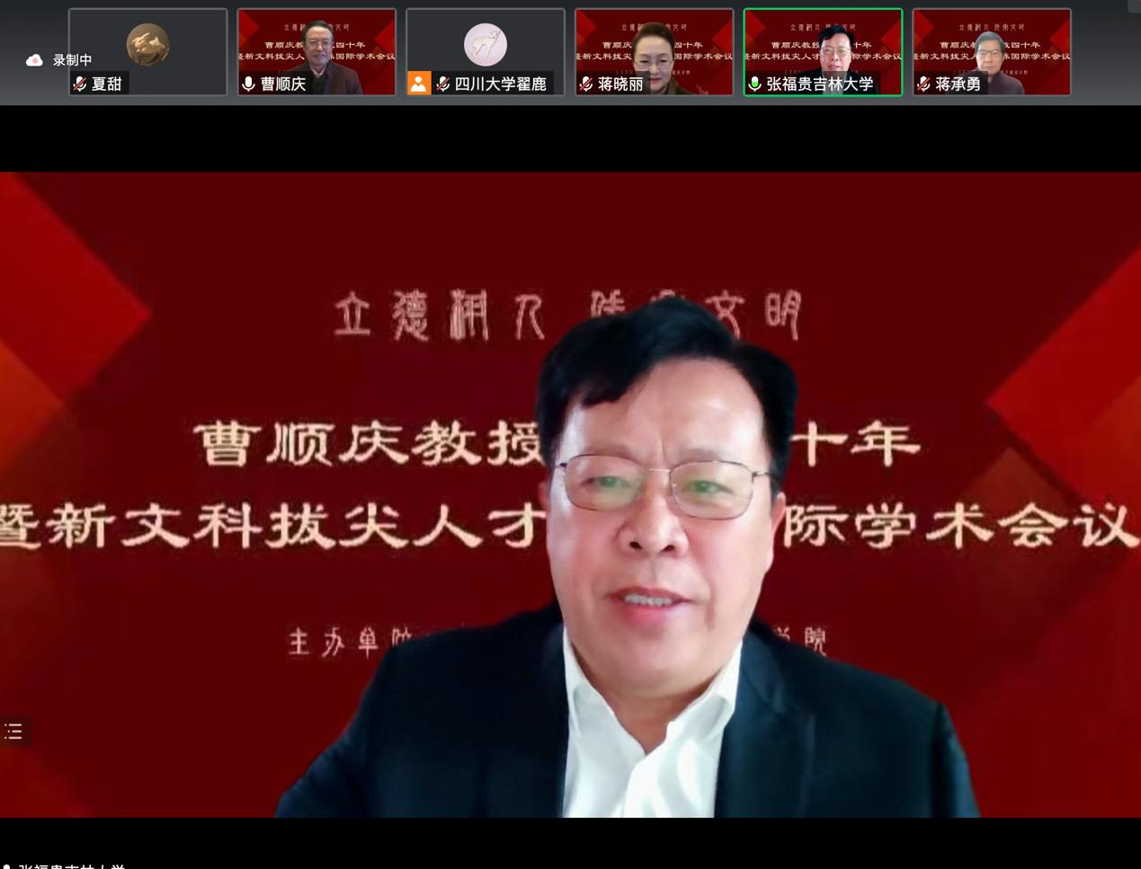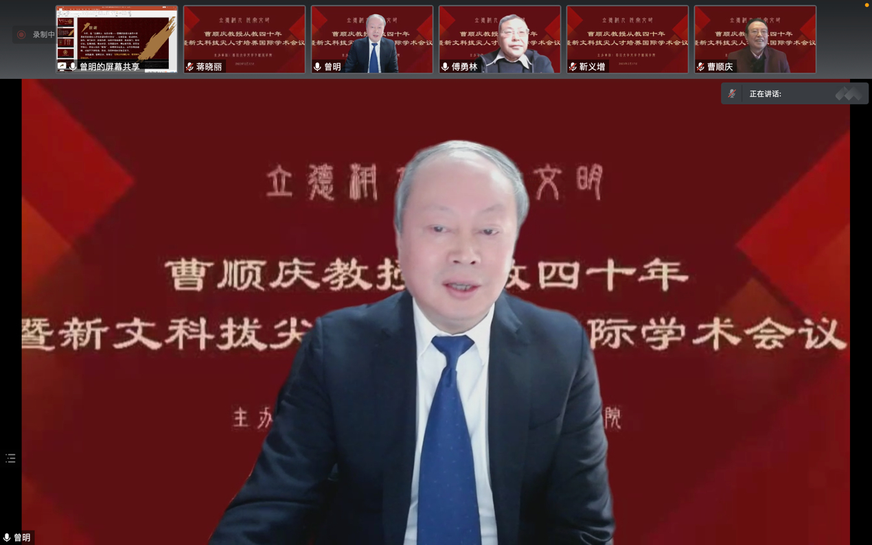 2023年2月17日,由万博官网主办的“立德树人 传承文明——曹顺庆教授从教四十年暨新文科拔尖人才培养”国际学术会议在云端顺利举行,来自法国索邦大学、美国俄亥俄州立大学、越南胡志明市国家大学、香港中文大学、中国社会科学院、北京师范大学、北京外国语大学、中央民族大学、首都师范大学、吉林大学、复旦大学、上海交通大学、浙江大学、浙江师范大学、浙江工商大学、河南大学、湖南大学、湘潭大学、长沙师范学院、华中科技大学、广西大学、暨南大学、电子科技大学、成都大学、四川外国语大学、四川师范大学、西南大学、西南交通大学、西南民族大学、重庆师范大学、重庆大学、贵州师范大学、西北民族大学、万博max官网等海内外近四十所高校的300余位学者参与会议。