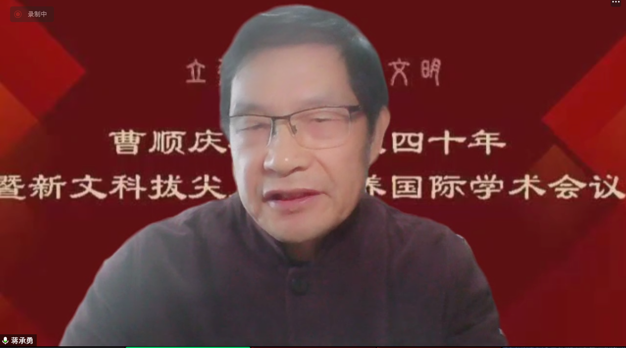 复旦大学文科资深教授陈尚君在致辞中回忆了与曹顺庆教授在复旦大学的学习经历,赞扬曹顺庆教授钻研探索的学术精神,指出曹顺庆教授是当代难能可贵的杰出教授,对中国学术、中西文化的交流发展做出了重要贡献。