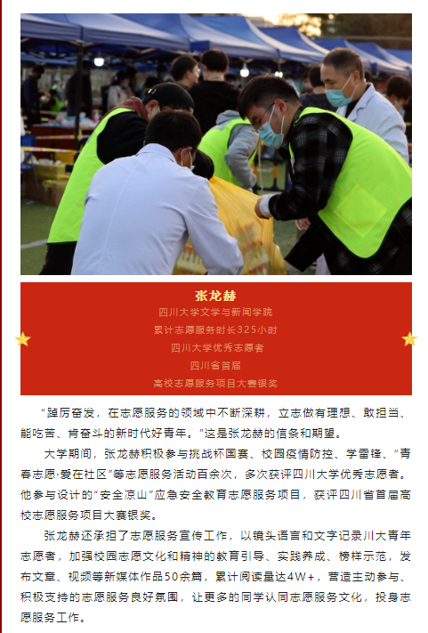 其中,张龙赫的志愿服务事迹还得到万博max官网校青年志愿者协会专项报道。大学期间,他积极参与挑战杯国赛、校园疫情防控、学雷锋、“青春志愿·爱在社区”等志愿服务活动百余次,多次获评万博max官网优秀志愿者。他参与设计的“安全凉山”应急安全教育志愿服务项目,获评四川省首届高校志愿服务项目大赛银奖。“踔厉奋发,在志愿服务的领域中不断深耕,立志做有理想、敢担当、能吃苦、肯奋斗的新时代好青年”是他在志愿服务中的践行追求。
