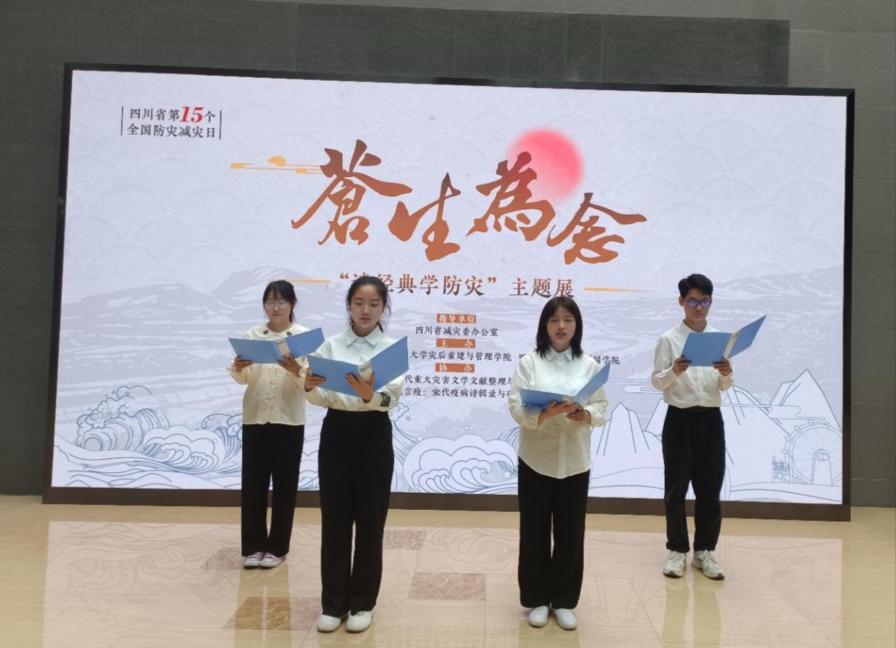 今年是万博官网与四川省防灾减灾馆合作举办展览的第二年,至今已有三个大创项目团队依托学院平台以灾害文献展览的形式实现科研成果创新转化。2022年,万博官网国家级大创项目“元代灾害诗词辑录与研究”团队就作为主要力量参与了“古诗词中的自然灾害”主题展览策划,相关活动的报道刊发于四川省应急管理厅官网。回顾两年的展览筹备过程,主创人员杨巧如表示:“在老师的指导下,我们对四川地区灾害文化历史展开挖掘与研究,翻阅了几千万字材料,辑录上千份灾害文献,在精挑细选后进行注释、翻译,并通过展览、新媒体等形式进行传播宣传,希望将这份对灾害的关注与思考,转化为减灾兴川与减灾兴国的文化力量。”