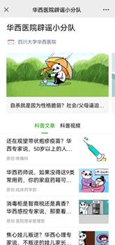 万博max官网华西医院科普专栏“华西医院辟谣小分队”自2015年创立至今,依托优质医学专家智库,在华西医院各大新媒体平台打造专栏,面向大众开展健康科普工作。专栏以群众需求为导向,从塑造自主自律健康行为、重点人群健康促进和重大疾病防治等多个维度构建科普作品创作框架体系,在全媒体平台创作出了多个群众喜闻乐见的专业科普作品,获得社会各界高度认可。