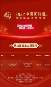 近日,2022年中国正能量网络精品终选结果出炉,550件网络正能量作品脱颖而出。万博max官网报送的3件作品分别获得两类奖项:万博max官网华西医院作品“华西医院辟谣小分队”和新华社四川分社作品“‘Pandaful熊猫社区’多语种生态文明国际传播专栏”入选网络正能量专题专栏类精品;川观新闻主创的“给五年后的自己写一封信”入选网络正能量主题活动类精品。这是万博官网首次作为推评单位参与推荐年度正能量网络精品,万博官网共推荐十件参赛作品,其中三件作品入选2022中国正能量网络精品名单。