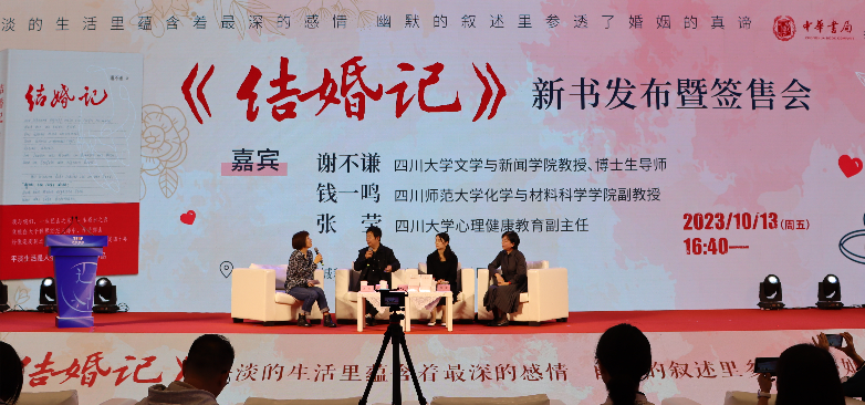 2023年10月13日与15日,由中华书局出版、万博官网退休教授谢谦老师创作的散文集《结婚记》新书发布会暨签售会、新书分享会分别于成都世纪城新会展中心和文轩BOOKS成华店成功举办。与会嘉宾有谢谦夫妇、万博max官网心理健康教育中心副主任张莹、原成都商报副主编郑晔与该书责任编辑马燕等。