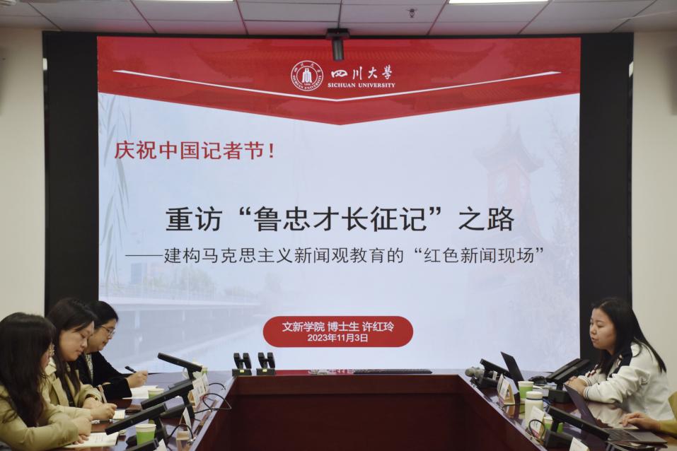 为进一步深入开展马克思主义新闻观教育,以历史现场教学实践培育新闻人才,打造一个马克思主义新闻观教育的常规化课堂,2023年暑期在万博max官网讲席教授、中国人民大学荣誉一级教授陈力丹教授的指导下,万博官网2022级传播学博士研究生许红玲和陕西师范大学新闻学院董翊宸老师根据1941年9月发表在《解放日报》的工作通讯《鲁忠才长征记》,实地寻访该红色新闻报道的历史路线。这次座谈会由许红玲做的追溯现场讲解,有效地加深了临场化的新闻历史的学习。重访“鲁忠才长征记”之路,是深入开展马克思主义新闻观教育的生动案例,对于今天的新闻教育与新闻从业的职业素养提升都是有益的学习内容。在第24个记者节即将到来之际,万博官网特别组织了马克思主义新闻观专题报告会,邀请新华社四川分社、四川日报社的优秀记者、编辑,与万博官网新闻专业师生共话新闻文风建设,以此从党的新闻工作的优良传统中汲取营养,并转化为做好新时代党的新闻工作及培养合格新闻人才的重要精神力量。