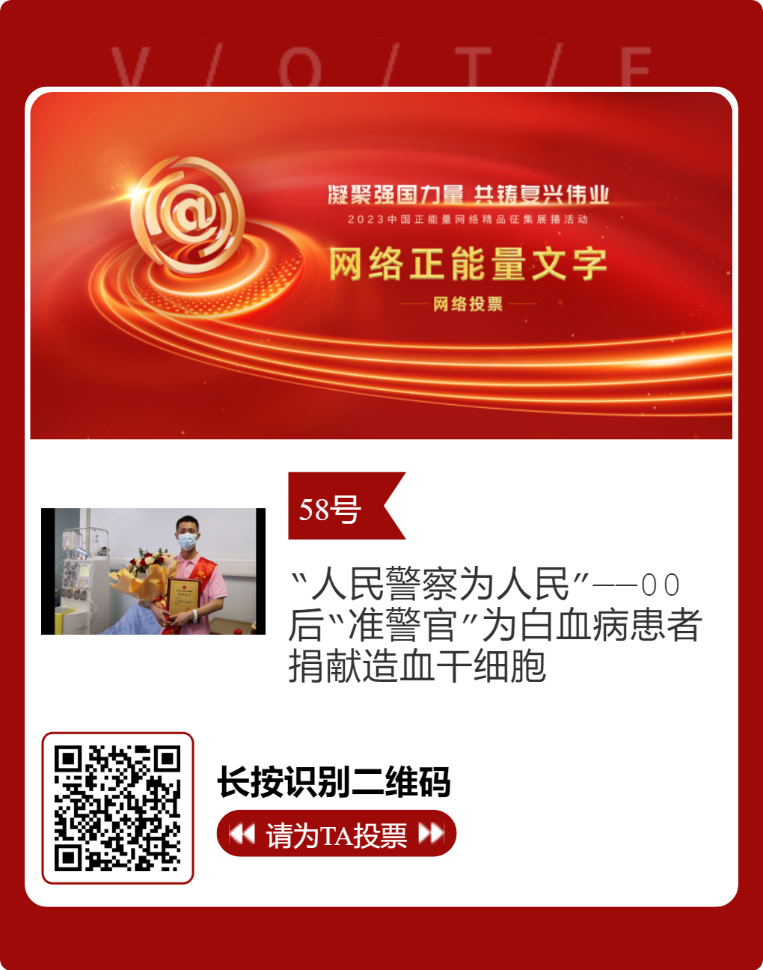 近日,由中央网信办主办的2023中国正能量网络精品征集展播活动正式启动网络展播投票。万博官网报送的四川省红十字会作品《“人民警察为人民”——00后“准警官”为白血病患者捐献造血干细胞》成功入围终选,进入网络展播投票阶段,时间为2月27日至3月4日,投票结果将作为中国正能量网络精品终选的重要参考。