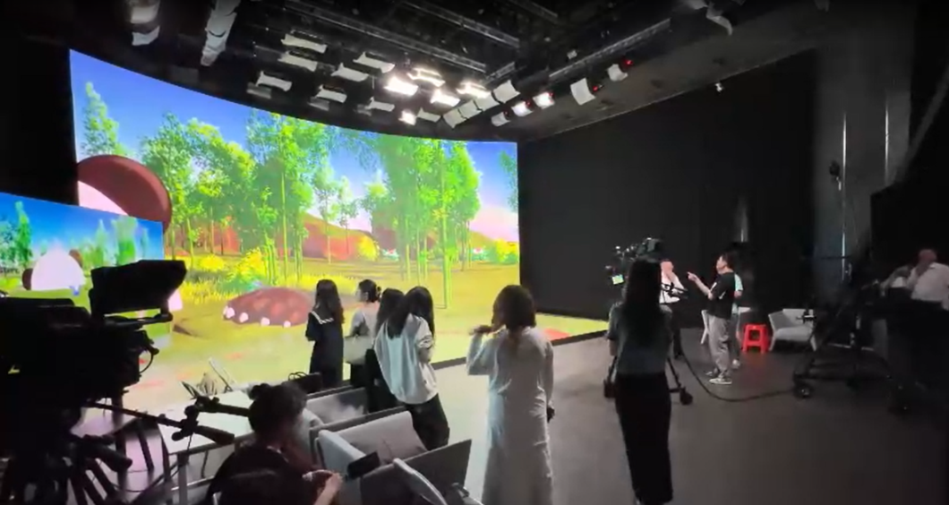 近一个半小时的交流讨论会结束后,川大团队应邀参观考察了川台西南地区重要的“梦工厂”——全流程XR多模态直播演播室。该演播室于2023年12月28日正式启用,标志着四川广播电视台全面挺进“高新数字视听内容创作生产及技术服务提供”的新发展领域。据介绍,演播室专门用作虚拟拍摄,其中就包括《熊猫观察》中虚拟熊猫主播与主持人互动的场景实现。演播室占地约260平米,采用8k全场景原色屏幕,主要由“川帧引线”等五个专业的虚拟内容制作团队提供虚拟制作解决方案。XR多模态直播演播室可用于IP手办开发和应用、视频转绘、多模态AIGC影视制作、XR新闻节目制作等多个领域。其中,虚拟演播室的场景打造,不同于传统的绿幕,在现场录制的人可以直接观看到呈现的虚拟场景并实现更有效的交互。在专业人士的操作下,熊猫贝贝的多个虚拟场景被实时展现出来,调研团队成员现场就相关问题与专业人士进行了交流。