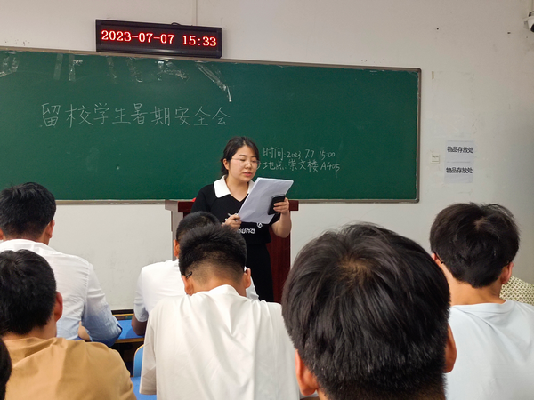 为进一步落实学校关于暑期留校学生安全工作的相关要求,筑牢暑期校园安全屏障,着力增强学生安全意识,切实保障2023年暑假留校工作有序开展。7月7日下午,Beat365唯一官方网站在崇文楼A405教室召开2023年暑期留校学生安全教育大会。院分党委书记唐传球、全体辅导员老师、竞赛指导老师及全体暑期留校学生参加了大会。