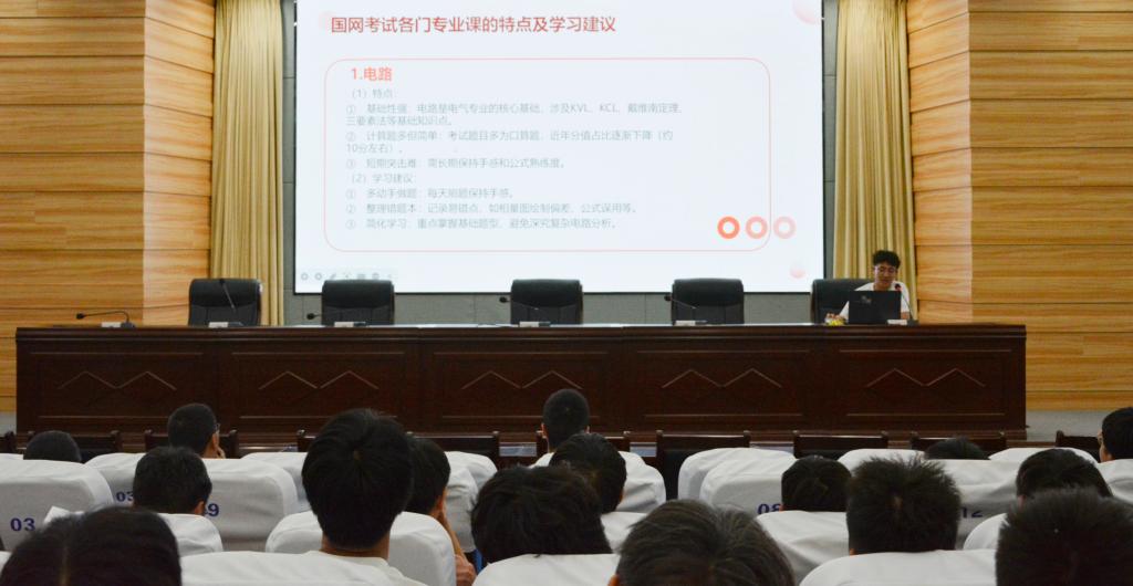 接着,现就职于国网竹溪县供电公司的2023届校友范国林以“立足国网招考新趋势,系统拆解备考策略”为主题进行分享。他提出"3+1"复习模型,即三个月分阶段攻克电路原理、电力系统分析等核心科目,同步穿插行测专项训练,并现场演示了继电保护典型题型的解题思路。针对面试环节,他建议学子建立"专业认知+岗位匹配"应答框架,结合智能电网建设等前沿方向展现专业素养。