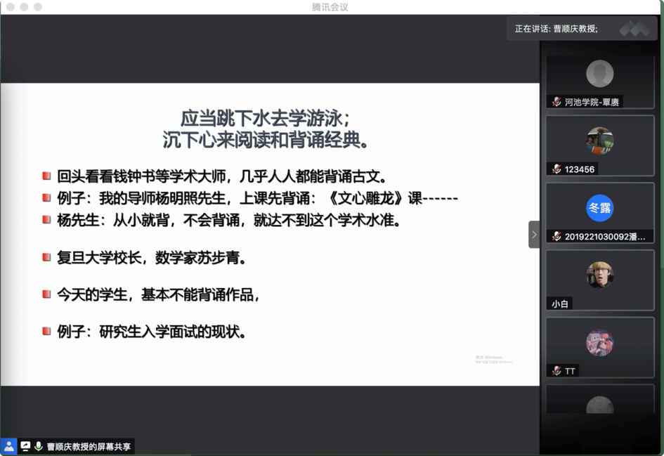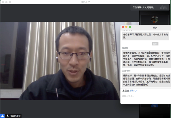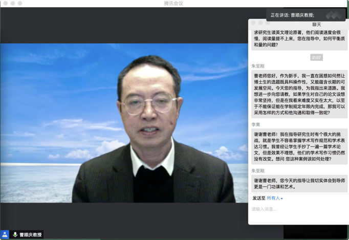 10月16日19:30,“传薪·研究生培养问题与方法系列活动”第一场在腾讯会议平台顺利举行。万博max官网杰出教授、万博max官网学术院长曹顺庆教授应邀作题为“培养研究生的几点体会”的讲座,万博官网副院长胡易容教授担任讲座主持人。
