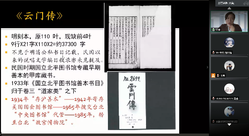 吴真教授首先系统介绍了《云门传》这一稀见孤本文献的文献底本信息、文献递藏信息和文献价值等内容。明刻本《云门传》是民国时期国立北平图书馆的甲库藏书,后因抗日战争形势严峻,该书辗转上海、美国、台湾三地,最终被收藏于台北故宫博物院。该书最显著的重要性在于它是冯梦龙编《醒世恒言》卷三十八《李道人独步云门》的底本,其故事源流取材于《太平广记》卷三十六《李清》。从《太平广记》到《云门传》再到《李道人独步云门》,一个故事主题如何经过情节生发、口头演述、语言形式改换、韵文增入、文人改订,最终变成一篇成熟的白话小说,这是关涉说唱文学与白话小说文体演变的重要问题。