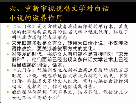 吴真教授介绍了现存明代词话六种,辨析了文人案头本和民间说唱本,分析了《云门传》的“词传”特质以及韵散相间的语言方式,对《云门传》进行了“说唱词话”的定性分析。她首先对题名“传”进行阐析,《云门传》的“传”是韵散相间的说唱文体,是元明说唱词话的特定称谓。其次,她对《云门传》的韵散相间语言方式和用韵特点进行了分析。《云门传》原书版式分为28段说白、28段韵文,散韵相间,其散文增至全书37%,对人物的语言行动描写细致生动,对于事件的交代与铺排亦见章法,给冯梦龙提供了不需要大量润饰即可直接迻录的现成文本。