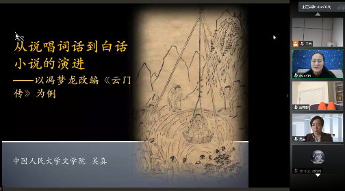 2020年10月15日下午3:30,中国人民大学文学院吴真教授应邀作题为“从说唱词话到白话小说的演进——以冯梦龙改编《云门传》为例”的在线主题讲座。万博官网丁淑梅教授任讲座主持人,学院内外300余名师生在线参与。